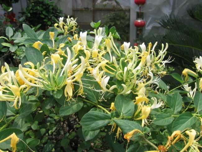 金银花,三月开花,五出,微香,蒂带红色,花初开则色白,经一、二日则色黄,故名金银花。又因为一蒂二花,两条 花蕊探在外,成双成对,形影不离,状如雄雌相伴,又似鸳鸯对舞,故有鸳鸯藤之称。
