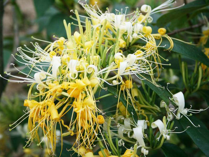 金银花属多年生半常绿缠绕及匍匐茎的灌木。小枝细长,中空,藤为褐色至赤褐色。卵形叶子对生,枝叶均密生柔毛和腺毛。夏季开花,苞片叶状,唇形花有淡香,外面有柔毛和腺毛,雄蕊和花柱均伸出花冠,花成对生于叶腋,花色初为白色,渐变为黄色,黄白相映,球形浆果,熟时黑色。