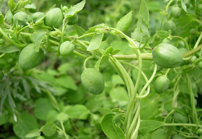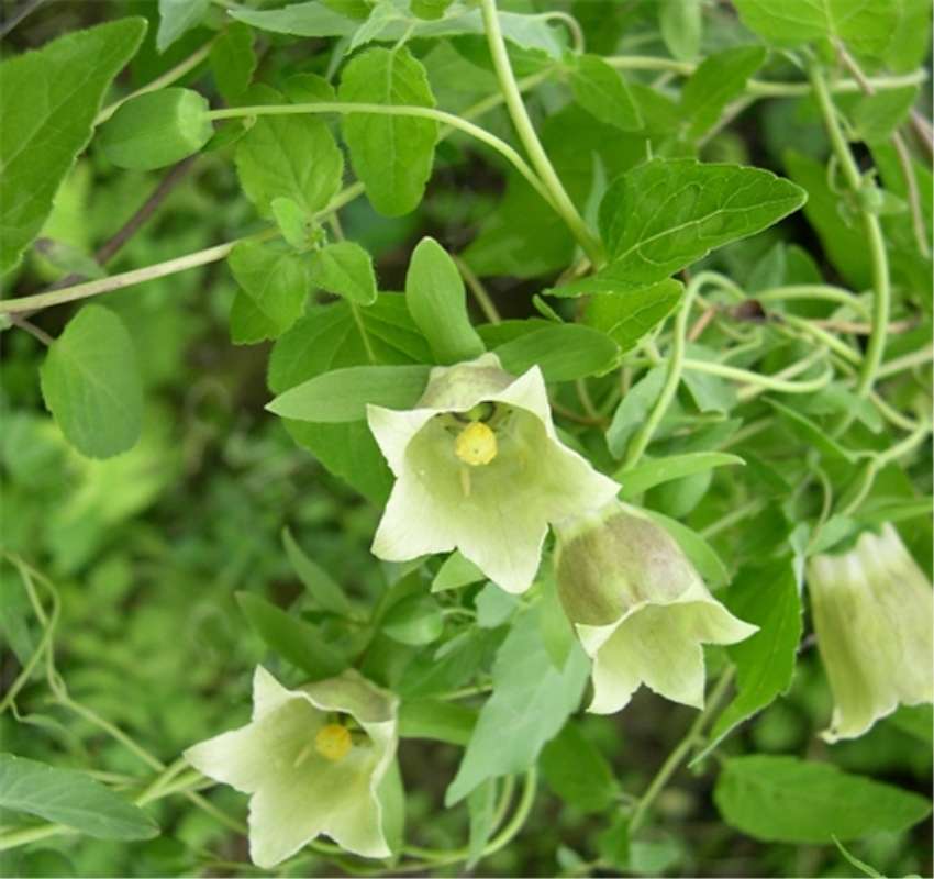 党参,桔梗科党参属,多年生草本植物,有乳汁。茎基具多数瘤状茎痕,根常肥大呈纺锤状或纺锤状圆柱形,茎缠绕,不育或先端着花,黄绿色或黄白色,叶在主茎及侧枝上的互生,叶柄有疏短刺毛,叶片卵形或狭卵形,边缘具波状钝锯齿,上面绿色,下面灰绿色,花单生于枝端,与叶柄互生或近于对生,花冠上位,阔钟状,裂片正三角形,花药长形,种子多数,卵形,7-10月开花结果。