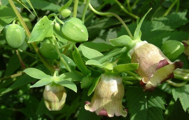 花单生于枝端,与叶柄互 生或近于对生,有梗。花萼贴生至子房中部,筒部半球状,裂片宽披针形或狭矩圆形,长1-2厘米,宽约6-8毫米,顶端钝或微尖,微波状或近于全缘,其间湾 缺尖狭;花冠上位,阔钟状,长约1.8-2.3厘米,直径1.8-2.5厘米,黄绿色,内面有明显紫斑,浅裂,裂片正三角形,端尖,全缘;花丝基部微扩 大,长约5毫米,花药长形,长5-6毫米;柱头有白色刺毛。蒴果下部半球状,上部短圆锥状。