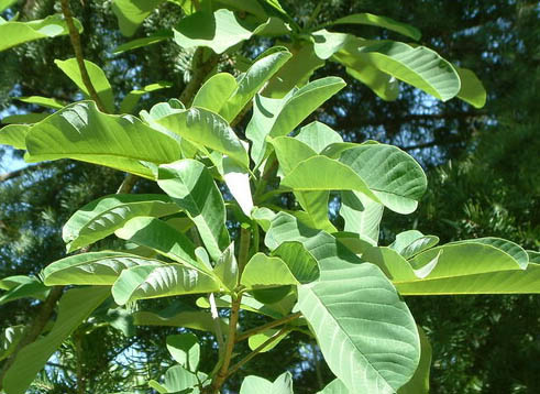 落叶乔木,高达20米;树皮厚,褐色,不开裂;小枝粗壮,淡黄色或灰黄色,幼时有绢毛;顶芽大,狭卵状圆锥形,无毛。叶大,近革质,7-9片聚生于枝端, 长圆状倒卵形,长22-45厘米,宽10-24厘米,先端具短急尖或圆钝,基部楔形,全缘而微波状,上面绿色,无毛,下面灰绿色,被灰色柔毛,有白粉;叶 柄粗壮,长2.5-4厘米,托叶痕长为叶柄的2/3。