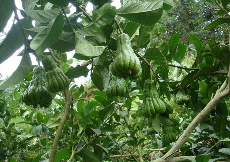 果实手指状肉条形,重可达2000克,果皮淡黄色,粗糙,果皮甚厚,难剥离,内皮白色或略淡黄色,棉质,松软,瓢囊10-15瓣,果肉无色,近于透明或淡乳黄色,爽脆,味酸或略甜,有香气;种子小,平滑,子叶乳白色,多或单胚。通常无种子。花期4-5月,果期10-11月。